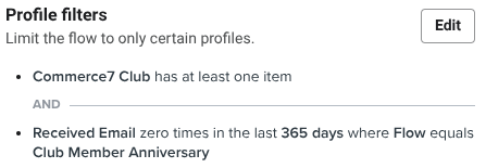 One, there's no way to add trigger filters for these types of flows, so we can't check to see if the club is actually still even active anymore. The best workaround for that seems to be adding a couple of profile filters as seen below. The first makes sure that they're still a club member at all, and the second one makes sure that they only get one club anniversary email a year. If they signup up, then cancel to switch to another club, they would still get the anniversary email from the first club signup date and the second one would be filtered out.